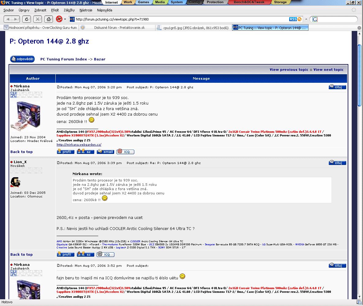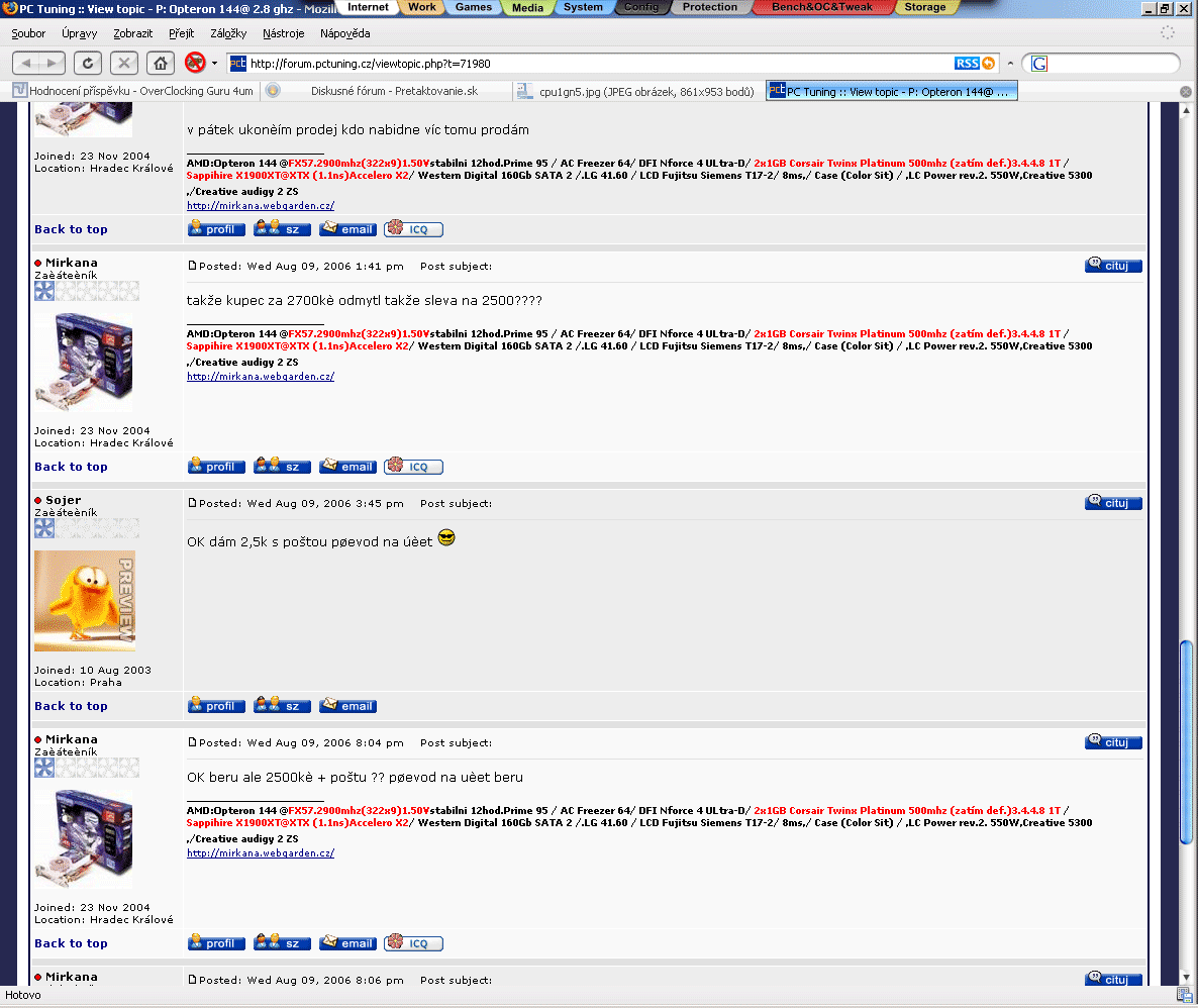 Podobně jako janovi555 mi do toho možná nic není, ale na druhou stranu jsou zde pravidla pro všechny. Nevyjádřím se konkrétně k Tvému případu, ale obecněji. Velice těžko může získat důvěru člověk, který to prodává na několika místech (jak sám tvrdí) a následně bude v threadu reagovat, že má nabídku (přes mail, přes známého,...) vyšší. Sorry, ale to zavání umělým navyšováním. Myslím, že je fér to nabízet na jednom místě, popř. když už to někdo dělá, tak alespoň tak, aby se to dalo ověřit (na jiných fórech). Nabídky přes mail, SZ apod. je nutné ignorovat, pokud dotyčný nenapíše do threadu (už to je snad dost podezřelé). Pravidla jsou tu, aby se dodržovala.