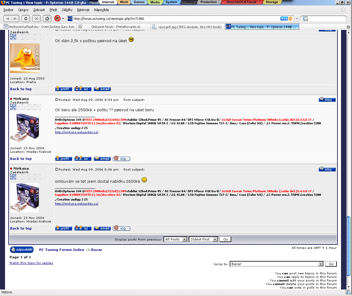 Abysme si rozuměli. Já to jinde nenabízel, jen se mi jeden z OC ozval mejlem. Mě zajímá, jak se "vedení" fóra staví k obchodování v bazaru, kde se často objevuje nabízím i jinde.